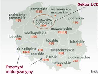 Rysunek 1 – lokalizacje podmiotów z kapitałem japońskim w Polsce, w nawiasach liczba fabryk.