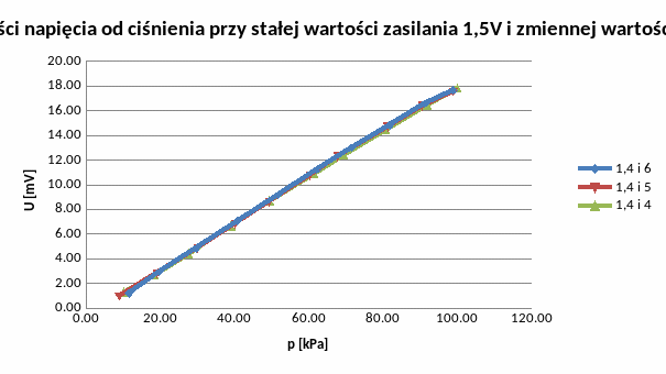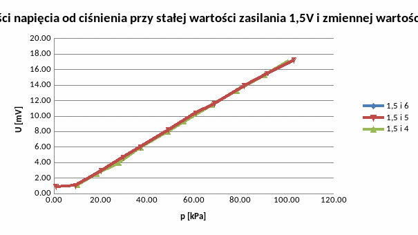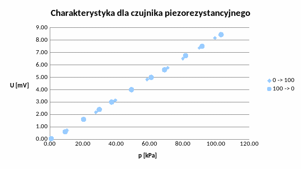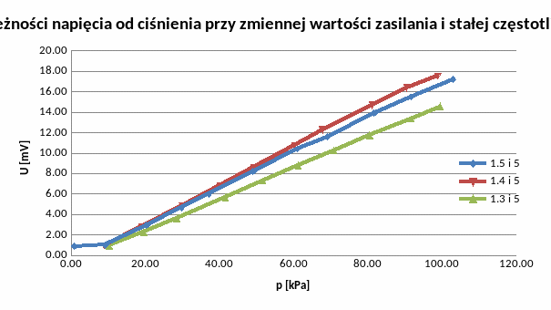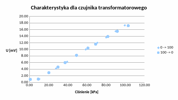 Ustawiliśmy wartość napięcia zasilającego na 1,5V, a częstotliwości na 5kHz. Wartości ciśnienia zmienialiśmy co około 10 jednostek wykonując pomiary od 0 do 100kPa i odwrotnie. Odczytywaliśmy wartości napięcia na wyjściu czujnika transformatorowego i piezorezystancyjnego. Poniżej tabela z otrzymanymi wynikami.