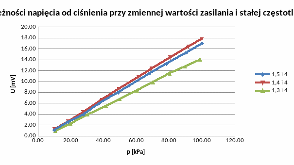 - na wykresach widzimy także wpływ częstotliwości napięcia zasilającego czujnik na wyjściowe napięcie czujnika. W przypadku napięcia zasilającego równego 1,5V wykresy dla częstotliwości 6, 5 i 4kHz znacznie odbiegają od siebie, dla zasilania 1,4V różnice są coraz mniejsze, aż w przypadku zasilania 1,3V praktycznie zanikają.