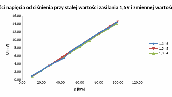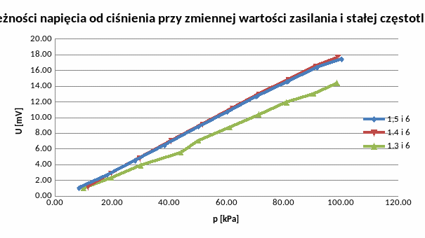 Prowadziliśmy odczyt wartości napięcia na wyjściu czujnika transformatorowego w następujący sposób: ustawialiśmy kolejno wartości napięcia zasilającego 1,5V, 1,4V i 1,3V i dla każdej z nich prowadziliśmy pomiary przy wartościach częstotliwości 6, 5 i 4kHz. Pomiary prowadzone były od 100 do 0kPa. Wyniki odczytów w tabelach poniżej.