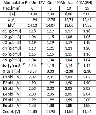 Ładowanie rozpoczęliśmy od zmierzenia poszczególnych parametrów przed rozpoczęciem ładowania. Po zmierzeniu rozpoczęliśmy ładowanie akumulatora które, trwało 15 minut. Badania parametrów akumulatora przeprowadziliśmy co 5 minut, po wcześniejszym odłączeniu prostownika. Wyniki pomiarów przedstawia tabela 3.