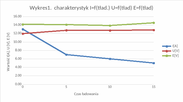 Na podstawie ćwiczenia 2.3. i 2.4. dowiedzieliśmy się jak wygląda ładowanie i jak zmienią się wartość charakteryzujące akumulator. Z wykresu.1 i wyników pomiarów odczytujemy że, wraz ze czasem ładowania natężenie prądu spada a napięcie i siła elektromotoryczna akumulatora wzrasta. Widzimy na podstawie charakterystyki natężenia, że w pierwszych 5 minutach akumulator pobiera najwięcej prądu, mówi na to nam, w wtedy akumulator się doładowuje, natomiast w następnych minutach podładowuje. Po dokonaniu obliczeń oraz przeanalizowaniu wyników dochodzimy do wniosku iż, siły elektromotoryczne każdego ogniwa są zbliżone do siebie wartościami, co także możemy zauważyć na wyznaczonej charakterystyce. Natężenie spada w zależności od czasu, ale zmierzone napięcia mieszczą się w dopuszczalnej granicy. Czym okres badania jest dłuższy tym mniejsze zanotowaliśmy natężenie. Dzieje się tak ponieważ im akumulator jest bardziej naładowany tym natężenie słabnie.