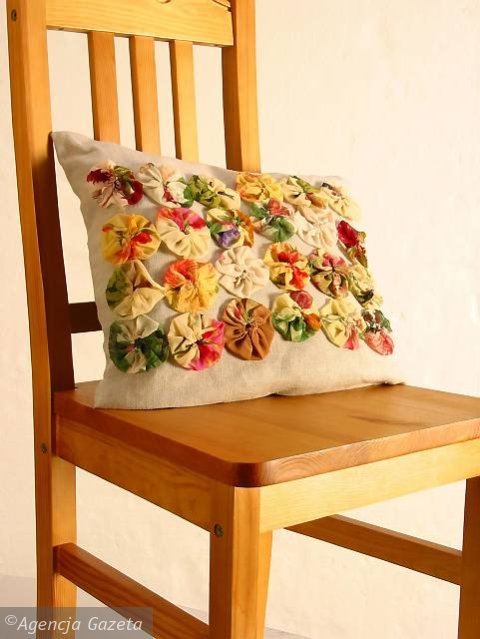 Lniana poduszka z kwiatkami-pomponikami będzie ozdobą pokoju w romantycznym stylu. Taki rodzaj patchworku nazywany jest Suffolk puffs (puszek z Suffolk). Tworzą go pomponiki z szyfonu, wiskozy lub bawełny. Natomiast poduszki z dżinsu ozdobione kwiatami z tego samego rodzaju tkaniny sprawdzą się w każdym nowoczesnym wnętrzu.