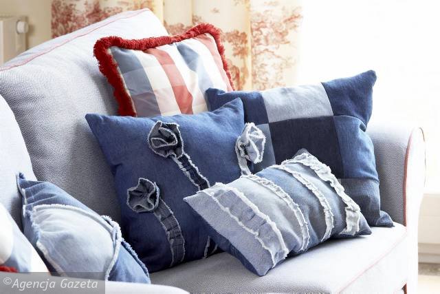 POSZEWKI NA PODUSZKI. Poduszki w poszewkach z dżinsu ozdobiono patchworkowymi aplikacjami z różnobarwnych kawałków dżinsowej tkaniny.