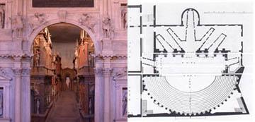 Teatro Olimpico w Vicenzy został zaprojektowany przez Palladia a zrealizował go Vincenzo Scamozzi . Mały, z kolumnadą, która otacza pólkolistą widownię i jest wyżej ozdobiona posągami (w dużej ilości). Dla widzów amfiteatralne siedzenia . Na scenie elegancka fasadę z której zdają się wychodzić trzy ulice przedłużone przez sztuczną perspektywę (“przyspieszoną perspektywę”- jak u Bramantego) .Zamyka go sufit pokryty freskami z wyobrażeniem nieba symulującymi antyczny teatr na świeżym powietrzu.