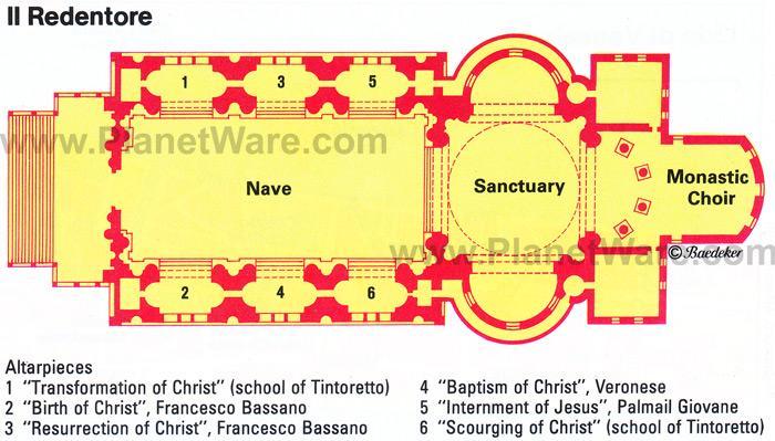 Il Redentore jest budowlą na planie krzyża łacińskiego. Pierwsza część to podłużna dość ciemna nawa z sześcioma kaplicami po bokach. Rytmizowany przez filary przyścienne, nakryty sklepieniem kolebkowym korpus, wyznacza ostatni odcinek drogi procesji i przyjmuje jej uczestników. Następnie dołącza się znacznie lepiej oświetlona budowla centralna trójlistnego prezbiterium, przykryta kopułą na tamburze i po bokach zamknięta przez prawie półokrągłe trybuny – część określająca wotywny charakter kościoła. Ostatnia partia budowli jest pomieszczeniem dla mnichów, usytuowanym za prezbiterium i eksedrą, optycznie oddzielone od dwóch poprzednich pomieszczeń.