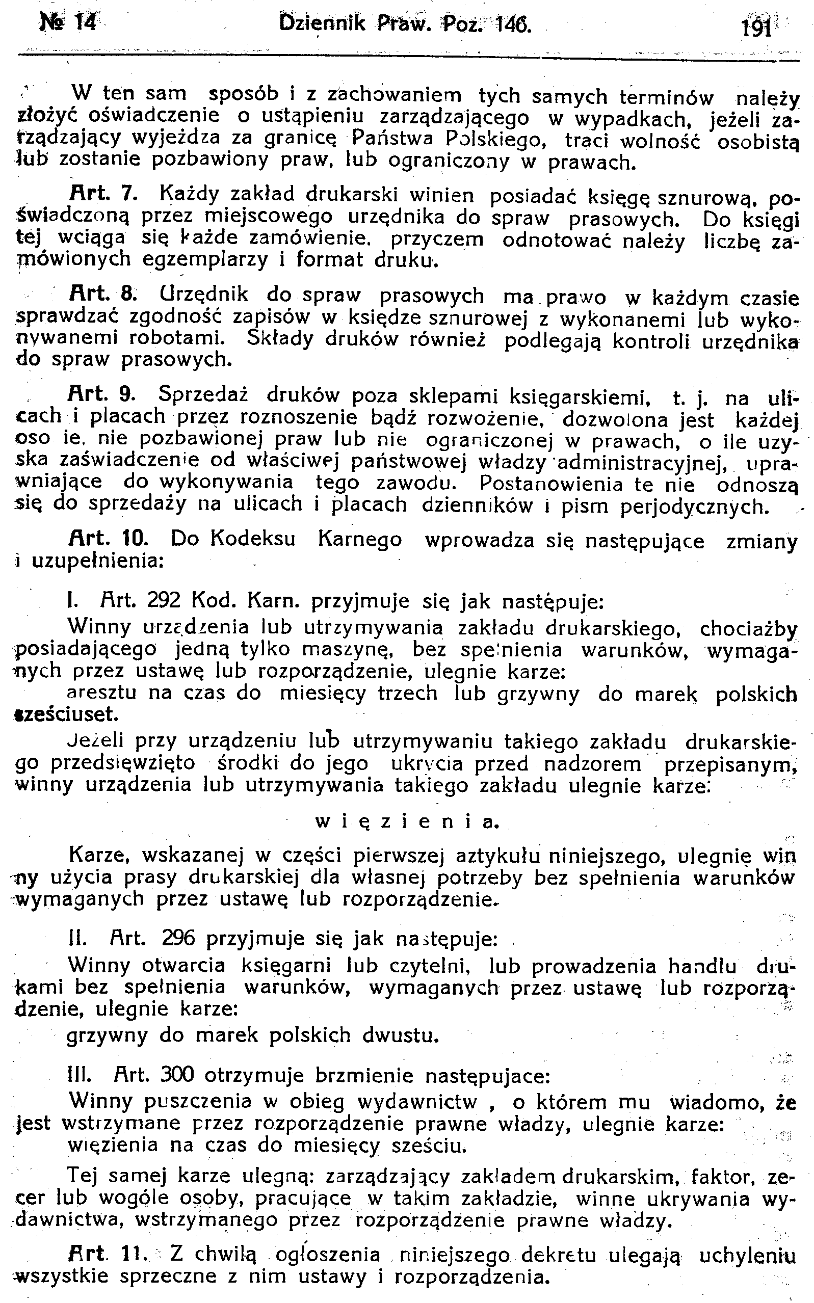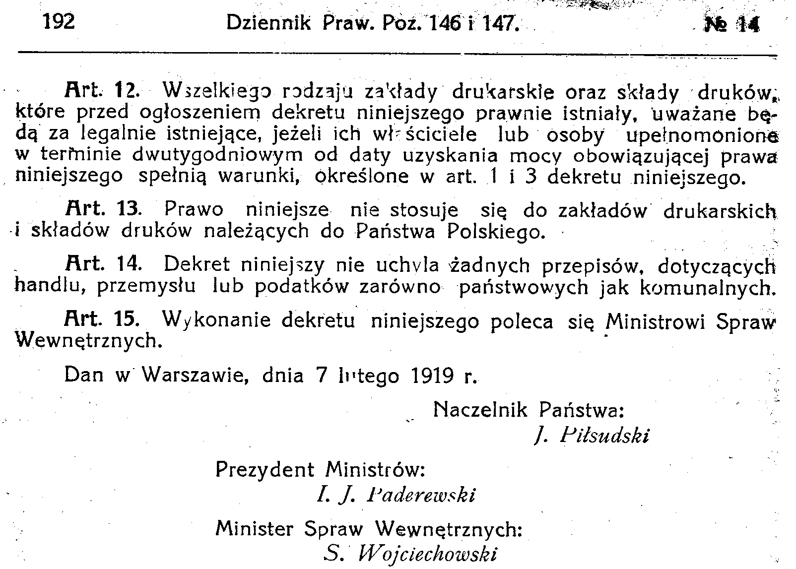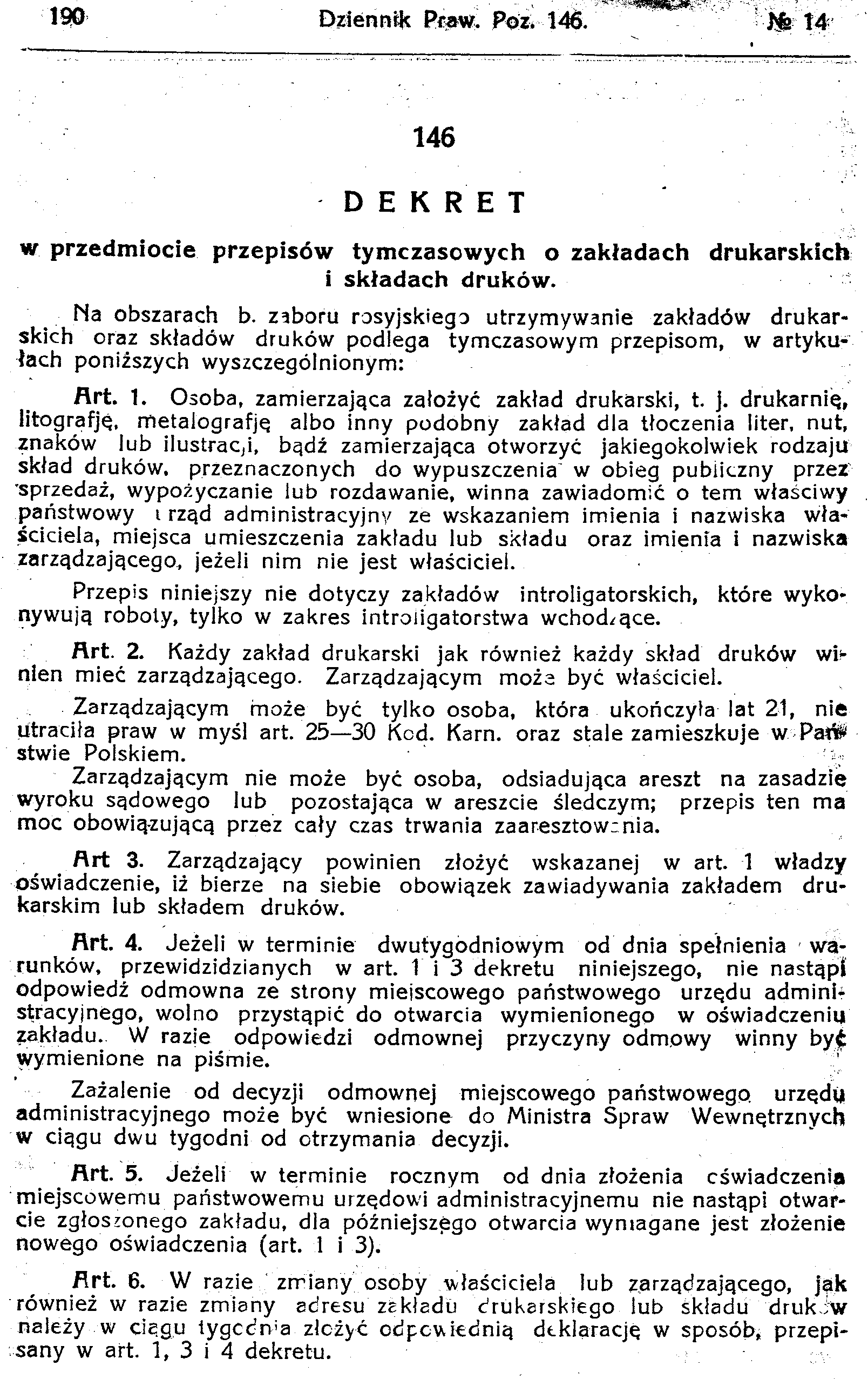 D19190146 Dekret w przedmiocie przepisów tymczasowych o zakładach drukarskich i składach druków