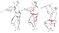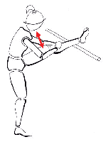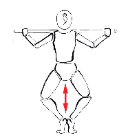 Robimy bardzo wolny skłon zginając kolana, gdzie ręce przekładamy powoli do tyłu – do pozycji „narciarza” przed wyskokiem; Pięty trzymają się podłoża.