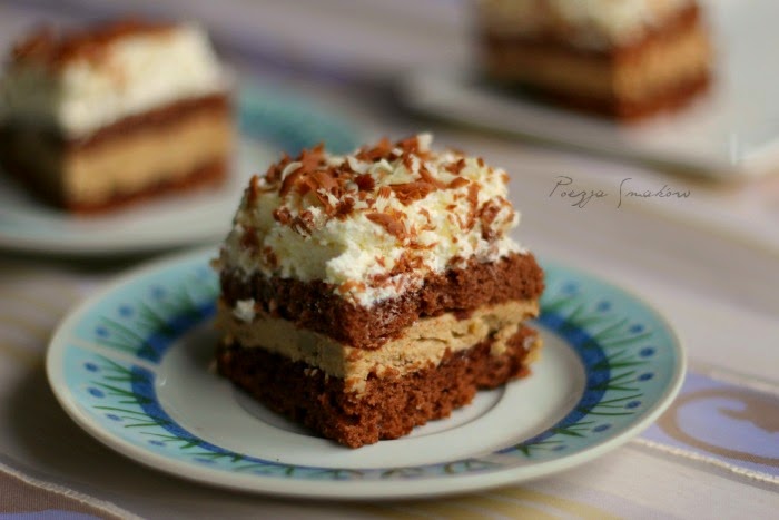 Na tarce o grubych oczkach zetrzeć czekoladę, obficie posypać wierzch ciasta. Wstawić do lodówki na minimum godzinę.