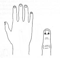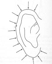 chorego ucha (palce ułożone prostopadle do małżowin usznych).