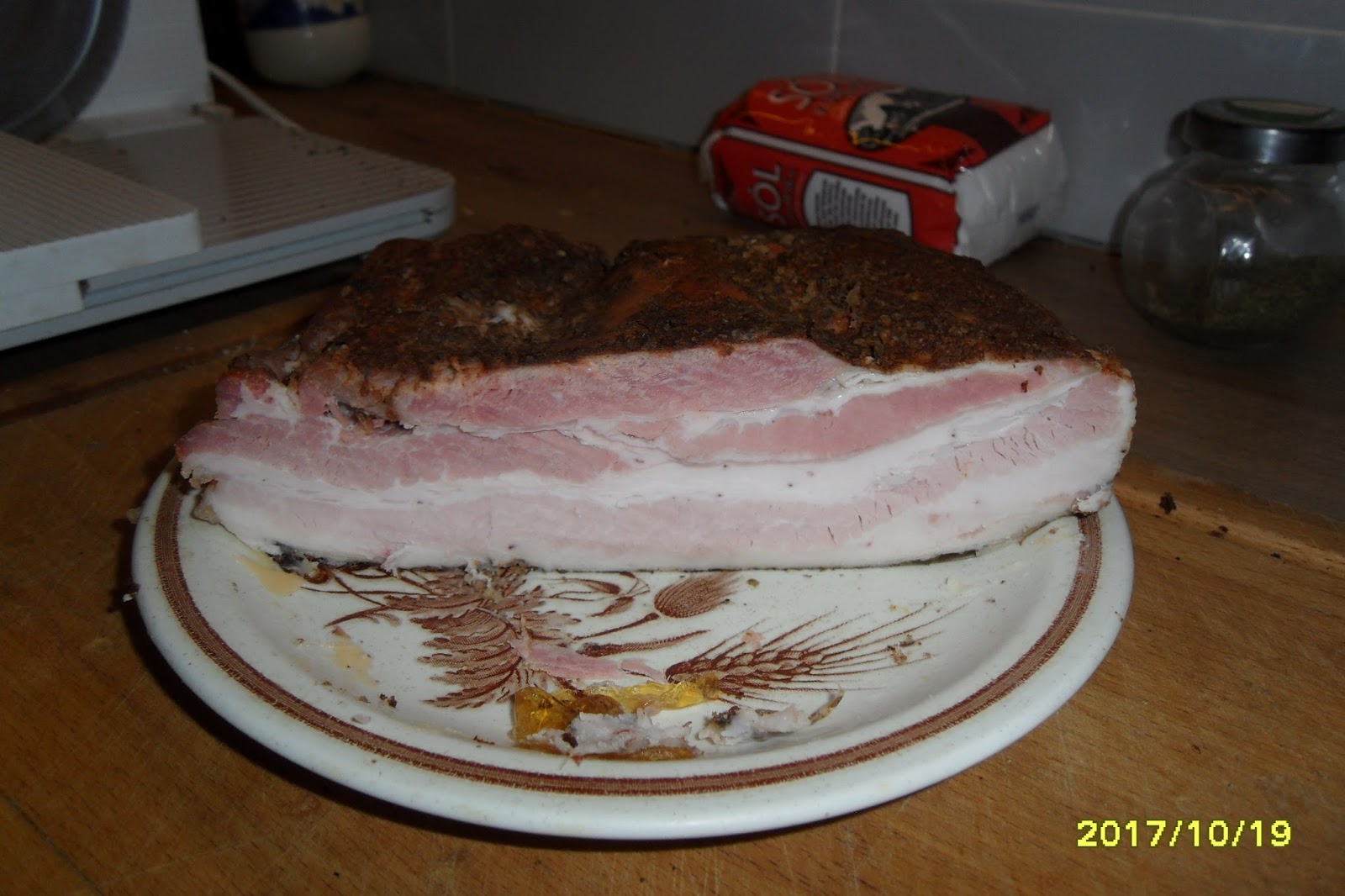 Po tym czasie wyjąć boczek, osuszyć i natrzeć przyprawami. odstawić do lodówki do następnego dnia