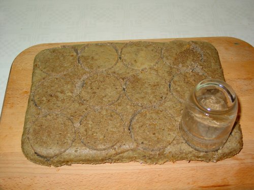 Wyłożyć pasztet na stolnicę i szklanką wyciąć krążki.