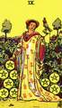 9 Denarów – to tez sukces materialny ale sukces materialny z którego już się nie musimy rozliczać. Jest to ten stan w którym cieszymy się z tego co posiadamy i nie tworzymy układu leku „a co nasz sąsiad powie na to skąd my tyle mamy „. My już w ogóle nie podlegamy tego typu rozliczeniom. Top nie znaczy ze nikt nie przyjdzie i nas nie zapyta ale my wtedy ze spokojem potrafimy odpowiedzieć „ bo mam „. Bez potrzeby tłumaczenia się . 9 Denarów zwalnia nas od potrzeby tłumaczenia się. Z tego dlaczego jest nam dobrze, dlaczego jesteśmy szczęśliwi i skąd w naszym życiu jest takie bogactwo.