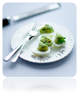 Połówki jajek nadziewać farszem tworząc na jajkach kopkę z farszu, udekorować majonezem i szczypiorkiem.