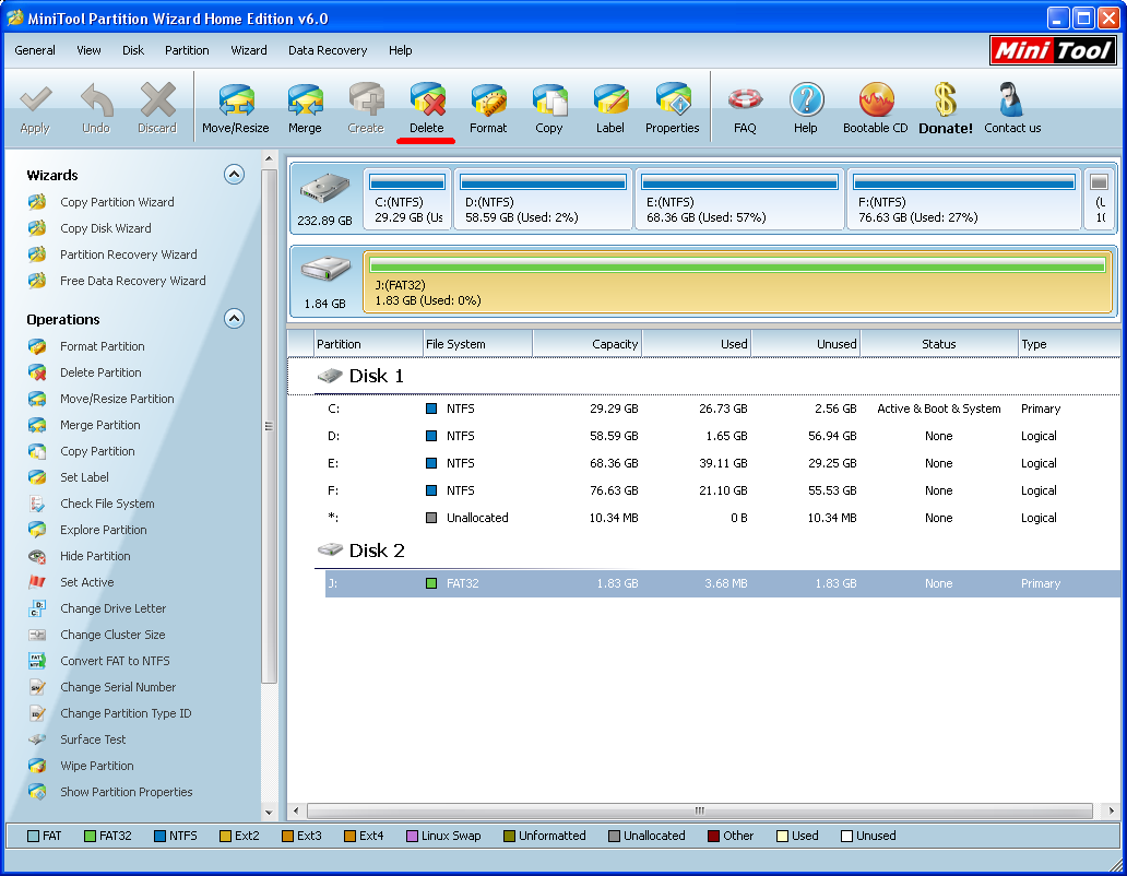 (w moim wypadku) na dysk J wybieramy Delete