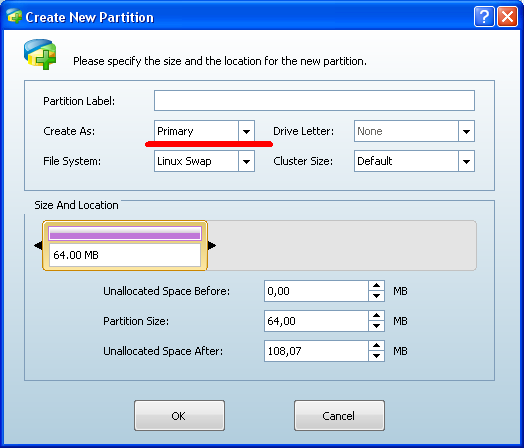 tworzymy partycje swap kilkajac ponownie na Unllocated następnie
