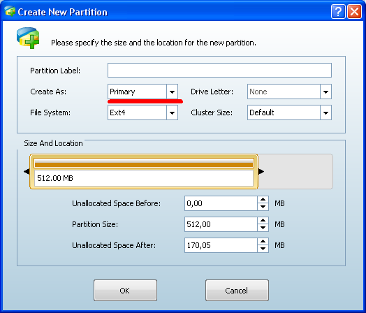 partycji dobrać tak żeby zostało nam miejsce na partycje ext/swap
