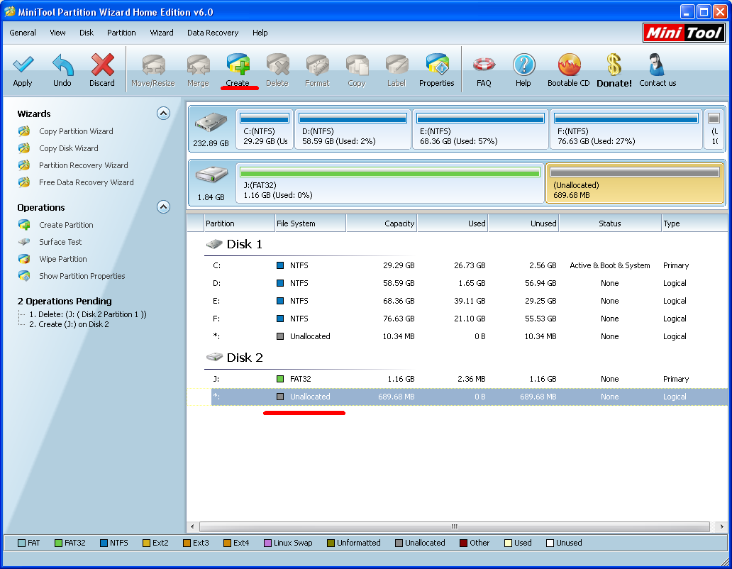 przechodzimy niżej i wybieramy Unllocated,jeszcze raz klikamy Create