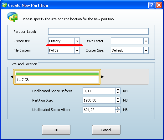 z następnego okna tworzymy nową partycje fat32 (wazne aby była ona