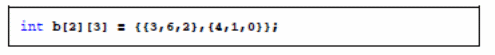 Po zadeklarowaniu tablicy, wartość jej elementów jest nieokreślona. Inicjalizacja polega na umieszczeniu w deklaracji po znaku równości, ujętej w nawiasy klamrowe, listy wartości kolejnych jej elementów. Poszczególne elementy tablicy umieszczone są w nawiasach klamrowych i oddzielone od siebie przecinkami. Deklaracja: