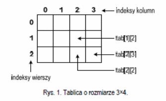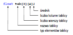 Powyższa deklaracja definiuje tablicę dwunastu elementów typu float, składającą się z trzech wierszy i czterech kolumn (Rys. 1).