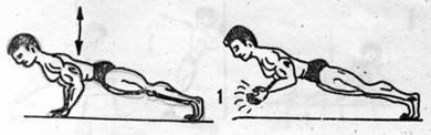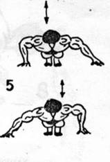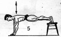 -wykonanie-tego ćwiczenia chyba nie trzeba bliżej opisywać-choć nie każdy wie, jak wykonać je poprawnie. Podstawowym błędem popełnianym przez ćwiczących jest wyginanie grzbietu w łuk do dołu. Poprawne wykonanie wymaga utrzymania tułowia w pozycji wyprostowanej przez cały czas trwania ćwiczenia. Drugim błędem jest zbyt mały zakres ruchu. Opuszczamy się zbyt płytko, a należy to zrobić do momentu, gdy klatka dotknie(nie uderzy, ale dotknie) podłogi, po czym powracamy(koniecznie bez podpierania się o podłogę klatką)do pozycji wyjściowej. Trzecim poważnym błędem jest niewłaściwe tempo-najczęściej jest ono zbyt szybkie. Właściwe tempo to ruch miarowy i wolny, z pełnym „czuciem” trenowanych mięśni. Kiedy już wiemy, jakie błędy powinniśmy wyeliminować przystąpmy do ćwiczeń. Pompki klasyczne można wykonywać pod różnymi kątami. Do zmiany kąta służyć nam mogą meble(krzesła, taboret, itp.).I tak np. jeśli chcemy zaatakować górną część klatki piersiowej wykonujemy pompki z nogami wyżej od reszty ciała(np. na taborecie-rys.5). Dla rozwoju wewnętrznych części mięśni klatki wykonujemy pompki w wąskim rozstawie rąk. Gdy chcemy mocniej zaangażować w ćwiczeniu tricepsy, a mniej klatkę to wykonujemy pompki wąsko, ale łokcie prowadzimy wzdłuż tułowia, a nie na boki(to z kolei angażuje mocniej mięśnie piersiowe).Gdy pragniemy, by rozciągnięcie mięśni było większe, a co za tym idzie, zakres ruchu i efektywność ćwiczenia były większe-wykonujemy pompki na trzech taboretach(krzesłach)-rys.3-jest to świetne ćwiczenie, porównywalne z wyciskaniem sztangielek na ławce poziomej.