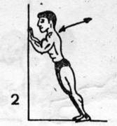 -wykonanie-rys.2a- kolejne bezprzyrządowe ćwiczenie-potrzebna jest jedynie ściana lub stabilny mebel. Stajemy przy ścianie/meblu i pochylamy się w jego kierunku, opierając się wyprostowanymi ramionami rozpoczynamy pompki. Ćwiczenie polega na opuszczaniu się w kierunku ściany/mebla i powrocie do pozycji wyjściowej. Tułów pozostaje wyprostowany przez cały czas trwania ćwiczenia.