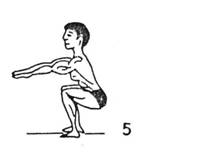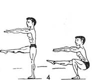 -wykonanie-jest to ćwiczenie podobne do przysiadów z obciążeniem-jedyną różnicą(poza brakiem obciążenia)jest ułożenie ramion-są wyprostowane do przodu, równolegle do podłogi(rys 5b). Można oczywiście, jeżeli ktoś jest przyzwyczajony do przysiadów ze sztangą na barkach i taka technika najlepiej mu wychodzi-trzymać ramiona w sposób pozorujący trzymanie gryfu sztangi. Można również, dla lepszej równowagi użyć np. kija od szczotki. W celu zwiększenia stopnia trudności ćwiczenie to można wykonywać na jednej nodze(rys.4c). Oddech bierzemy przed rozpoczęciem przysiady-powietrze wypuszczamy, gdy podnosimy się z przysiadu.