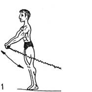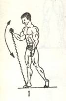 -wykonanie-rys.1b- Stajemy w lekkim wykroku(jedna noga lekko wysunięta)o nią zahaczamy jedną rączkę ekspandera, drugą zaś chwytamy w dłoń i uginamy ramię, jak w ćwiczeniu ze sztangielką lub rączką wyciągu. Druga ręka zwisa swobodnie obok tułowia. Ruch miarowy, tempo wolne.
