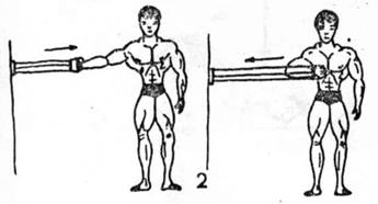 -wykonanie-rys.2b.Do tego ćwiczenia potrzebny będzie, poza ekspanderem stabilny punkt do zamocowania końca ekspandera. Mogą to być np. kaloryfery lub klamka drzwi. Stajemy(lub klękamy-jeśli nasz punkt zaczepu jest nisko -np. kaloryfer), tułów wyprostowany, jedna ręka zwisa luźno obok tułowia, drugą chwytamy rączkę ekspandera i przyciągamy przed sobą lekko ugiętym ramieniem. Ruch powinien być miarowy, bez szarpania.