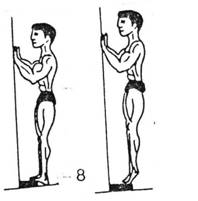 -wykonanie- Analogicznie, jak przy przysiadach jest to ćwiczenie z techniką podobną do ćwiczenia z obciążeniem. Stajemy przy jakimś punkcie oparcia(dla zachowania równowagi podczas ćwiczenia)-może to być ściana(rys 8a),krzesło, bądź jakikolwiek stabilny sprzęt domowy. Pod palce kładziemy grubą podkładkę, dla zwiększenia zakresu ruchu. W celu zwiększenia stopnia trudności można ćwiczenie wykonać na jednej nodze.