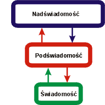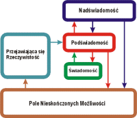 Aby bardziej temat ten sobie przybliżyć, skoncentrujmy się teraz na zapoznaniu się z funkcjonowaniem narzędzia, za pomocą którego tworzymy oraz doświadczamy efektów naszego tworzenia tu na Ziemi. Ponieważ na cały, rozgrywający się wokół proces spoglądać będziemy "ludzkimi" oczami, to oczywistym jest, że formę ludzką przyjmiemy za główny i obowiązujący w większości przypadków punkt odniesienia do analizy całego procesu. W takiej sytuacji bardzo dobrze jest spojrzeć na człowieka, w psychologicznym aspekcie przeprowadzanej analizy, jak na trójczłonowy byt, składający się z podświadomości, świadomości i nadświadomości (rysunek nr.2). W modelu tym Nasze ciało potraktujemy jako środek transportu naszego psychicznego aspektu, a także jako źródło pozyskiwania informacji (za pomocą zmysłów) oraz przekształcania tych informacji (za pomocą układu nerwowego i mózgu) do formy, umożliwiającej dalszą ich obróbkę w psychicznej już postaci. Jak więc widać, mózg jako taki nie stanowi sobą naszego umysłu, lecz raczej potężne urządzenie sterujące procesem biologicznego życia, a także przetwarzające pozyskiwane z zewnątrz informacje do postaci nadającej się do dalszej ich obróbki przez właściwy już umysł. Aby temat ten uporządkować załóżmy, iż umysł stanowi sobą całość naszej psychiki, w tym każdy jej emocjonalny oraz mentalny element i aspekt. Tak rozumiany umysł nie ma jakiejś szczególnej lokalizacji – w praktyce ma wiele warstw, z których najbliższe wypełniają oraz otaczają ludzkie ciało, zaś dalsze rozciągają się daleko poza jego granice, łącząc się z innymi umysłami, a także tworząc w ten sposób zbiorowy system tzw. nieświadomości zbiorowej.