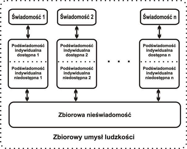 Zanim jednak omówimy zbiorowy umysł ludzkości, przypomnijmy wcześniej podstawowe informacje, dotyczące szeroko rozumianego, indywidualnego umysłu człowieka. Potraktujmy przy tym nasze ciało jako środek transportu naszego psychicznego aspektu, a także jako źródło pozyskiwania informacji (za pomocą zmysłów) oraz przekształcania tych informacji (za pomocą układu nerwowego i mózgu) do formy, umożliwiającej dalszą ich obróbkę w psychicznej już postaci. Jak więc widać, mózg jako taki nie stanowi sobą naszego umysłu, lecz raczej potężne urządzenie sterujące procesem biologicznego życia, a także przetwarzające pozyskiwane z zewnątrz informacje do postaci nadającej się do dalszej ich obróbki przez właściwy już umysł. Aby temat ten uporządkować załóżmy, iż umysł stanowi sobą całość naszej psychiki, w tym każdy jej emocjonalny oraz mentalny element i aspekt. Tak rozumiany umysł nie ma jakiejś szczególnej lokalizacji – w praktyce ma wiele warstw, z których najbliższe wypełniają oraz otaczają ludzkie ciało, zaś dalsze rozciągają się daleko poza jego granice, łącząc się z innymi umysłami, a także tworząc w ten sposób zbiorowy system tzw. zbiorowej nieświadomości. Mówiąc o świadomości, należy ją odróżnić od świadomości Istoty duchowej, jaką jesteśmy naprawdę – poprzez analogię świadomość ludzkiego nośnika (nośnika świadomości Istoty) przyrównać można do analitycznego, z elementami syntezy komputerowego programu, który dla swoich celów wykorzystuje zapisane w pamięci dane i podprogramy, i na ekranie monitora prezentuje przejściowe oraz ostateczne wyniki przeprowadzanych analiz. Z kolei podświadoma część ludzkiego umysłu wyposażona jest w ogromną „moc obliczeniową” oraz w nieograniczone zasoby pamięci – praktycznie wszystko, co pojawi się w zasięgu pięciu, dobrze wykształconych zmysłów, jest zapisywane w podświadomych zbiorach pamięci. Podświadomość nie ma jednak możliwości logicznego rozumowania, a przez to tworzenia nowych pojęć i schematów – zdana jest więc zawsze na znane sobie mechanizmy porządkowania, wartościowania i oceniania. W przypadku pojawienia się jakościowo nowych sytuacji, podświadomy umysł zakwalifikuje je do jednej z sobie znanych kategorii posiadanej klasyfikacji, chociaż sytuacja ta z klasyfikacją tą może mieć niewiele wspólnego. Zanim jednak to uczyni, wyświetla na „ekranie” świadomego oglądu problem, domagając się od świadomej części ludzkiego umysłu podjęcia decyzji – jeśli nie otrzyma dyspozycji (człowiek nie uświadomi sobie specyfiki nowej sytuacji), to sama rozstrzyga problem w podany wyżej sposób, a jeśli kompletnie nie wie, co zrobić z danym tematem, to spycha go w peryferia swoich zapisów do zbioru niezidentyfikowanych informacji. Natomiast świadoma część ludzkiego umysłu dysponuje możliwością logicznego myślenia oraz tworzenia nowych pojęć i schematów funkcjonowania, lecz jej „pamięć operacyjna” jest bardzo mała (niewiele informacji można jednocześnie utrzymać w polu świadomego oglądu) oraz niewielka jest jej moc obliczeniowa (gdyby założyć, że podświadomość przetwarza informacje z prędkością milionów bitów na sekundę, to świadomość w ciągu sekundy zdolna jest do przetworzenia jedynie pojedynczych bitów informacji). Świadomość człowieka utrzymuje ciągły kontakt z podświadomością – wręcz jest zarzucana dużą ilością tematów do przetworzenia i oceny, lecz ze względu na niewielkie pole operacyjne oraz małą prędkość przetwarzania informacji, otrzymywane dane odbiera często jako informacyjny szum, co powoduje, że efektywność działania świadomości jest w praktyce niewielka. W sposób umowny podświadomość podzielić można na dwie części: dostępną i niedostępną świadomemu oglądowi. W pierwszej z nich zachodzą procesy, służące przede wszystkim kontaktom z otoczeniem i umiejętnościom zaistnienia wśród innych form przejawionego w trójwymiarowej rzeczywistości życia, zaś w drugiej w dużej części funkcjonują mechanizmy, utrzymujące w efektywnej funkcjonalności całą, niezwykle złożoną ludzką strukturę.