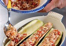 Piekarnik nagrzać do 180 st. Blachę do pieczenia wysmarować tłuszczem. Cukinie przekroić wzdłuż na pół. Łyżeczką wybrać ostrożnie miąższ i grubo go posiekać (bez pestek). Na patelni podgrzać olej, dodać cebulę, pokrojoną paprykę, czosnek i boczek. Poddusić mieszając. Dodać mielone mięso i smażyć aż się całość zarumieni, a sok odparuje. Doprawić tak, żeby danie było pikantne. Ważne, gdyż sama cukinia jest mało wyrazista w smaku. Dodać ryż, przecier pomidorowy (lub kawałki pomidora), zioła, chili i ew. posiekany miąższ cukinii. Mieszając smażyć kilka minut. Masę nałożyć do wydrążonych cukinii i posypać serem. Piec ok 30 min. aż zmiękną.