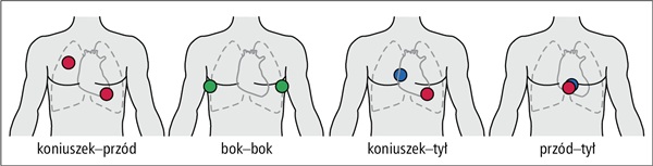 przyklejenie elektrod – ułożenie przednio tylne, jeśli elektrody nie umożliwiają jednocześnie defibrylacji, albo takie jak do defibrylacji, jeśli mogą do niej posłużyć;