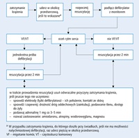 4) oceń rytm na kardiomonitorze defibrylatora (po przyłożeniu łyżek lub przyklejeniu elektrod) – wskazaniem do wyładowania elektrycznego jest VF lub VT bez tętna; na czas ładowania defibrylatora wznów podstawową CPR (łyżki defibrylatora oderwij od klatki piersiowej) 5) ustaw energię wyładowania a) u dorosłych – defibrylator dwufazowy, zależnie od modelu, pierwsze wyładowanie zwykle 150 J, a jeśli instrukcja urządzenia nie jest dostępna – 200 J; energię kolejnych wyładowań można zwiększać do maks. 360 J; defibrylator jednofazowy 360J (pierwsze i kolejne wyładowania) b) u dzieci – 4 J/kg mc. (pierwsze i kolejne wyładowania) 6) naładuj defibrylator (przycisk „ładowanie” [charge]) 7) wezwij wszystkich uczestników akcji reanimacyjnej do odsunięcia się od chorego i sprawdź, czy nikt nie dotyka chorego lub przedmiotów, z którymi chory ma kontakt; w tym momencie przerwij podstawową CPR, a jeśli stosujesz łyżki defibrylatora - przyłóż je ponownie do miejsc pokrytych wcześniej żelem 8) wyzwól wyładowanie (przycisk „wyładowanie” [discharge] lub „wstrząs” [shock]). Po wyładowaniu kontynuuj podstawową CPR przez 2 min (5 cykli złożonych z 30 uciśnięć mostka i 2 oddechów ratowniczych). Następnie oceń rytm serca – jeśli pierwsze wyładowanie nie jest skuteczne, podejmij kolejną próbę defibrylacji i ewentualne następne co 2 min, a w przerwach między wyładowaniami kontynuuj podstawową CPR, wprowadź kaniulę do żyły, wykonaj intubację tchawicy i podawaj leki (zob. algorytm ALS). Po pierwszych 3 nieskutecznych wyładowaniach i kolejnych 2 min wstrzyknij adrenalinę 1 mg i.v. i amiodaron 300 mg i.v. przed planowaną czwartą próbą defibrylacji (podczas podawania leków nie przerywaj CPR). Jeśli czwarta próba defibrylacji również jest nieskuteczna – kolejne wyładowania co 2 min i adrenalina 1 mg co 3–5 min; rozważ podanie jeszcze 150 mg amiodaronu i poszukuj odwracalnych przyczyn. Można też zmienić położenie łyżek defibrylatora – ułożenie przód–tył lub w przeciwległych liniach pachowych środkowych. |