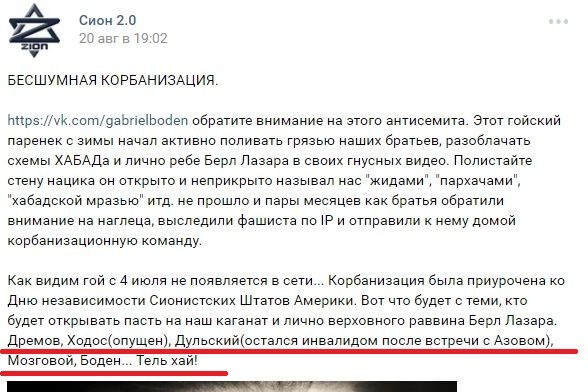 Jak widać goj od 4 lipca nie pojawił się w sieci… Korbanizacja została powiązana w czasie z dniem niepodległości Syjonistycznych Stanów Ameryki. Oto co będzie z tymi, którzy zechcą otwierać paszczę na nasz kaganat i osobiście na naczelnego rabina Berie Lazara. Dremow, Chodos (opuszczeni), Dulski (został inwalidą po spotkaniu z Azowem), Mozgowoj, Boden… Tel Hai!”