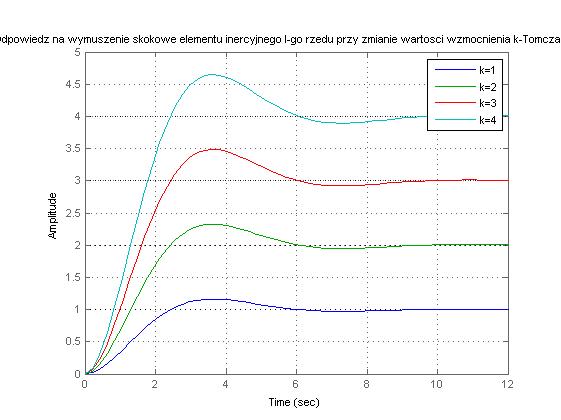 figure(1), step(G),hold on, grid on, legend('k=1','k=2','k=3','k=4'),title('Odpowiedz na wymuszenie skokowe elementu inercyjnego I-go rzedu przy zmianie wartosci wzmocnienia k-Tomczak Anna')