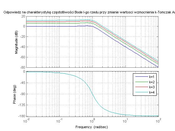 figure(3), bode(G),hold on, grid on, legend('k=1','k=2','k=3','k=4'),title('Odpowiedz na charakterystykę częstotliwości Bode I-go rzedu przy zmianie wartosci wzmocnienia k-Tomczak Anna')