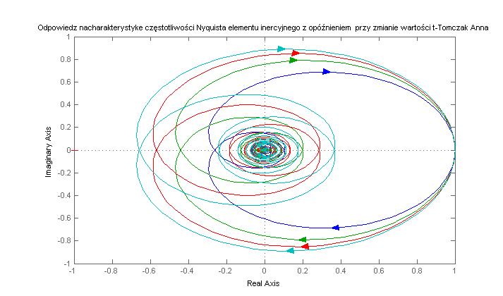 figure(4), nyquist(G),hold on, title('Odpowiedz nacharakterystyke częstotliwości Nyquista elementu inercyjnego z opóźnieniem przy zmianie wartości t-Tomczak Anna')