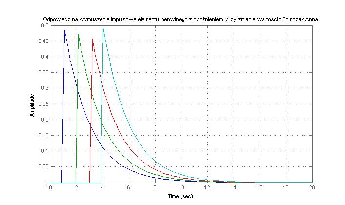 figure(2), impulse(G),hold on, grid on, title('Odpowiedz na wymuszenie impulsowe elementu inercyjnego z opóźnieniem przy zmianie wartosci t-Tomczak Anna')
