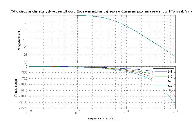 figure(3), bode(G),hold on, grid on, legend('t=1','t=2','t=3','t=4'),title('Odpowiedz na charakterystykę częstotliwości Bode elementu inercyjnego z opóźnieniem przy zmianie wartosci t-Tomczak Anna')