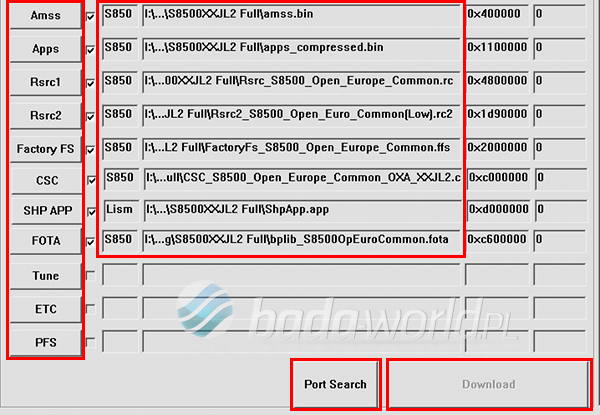 opcje Boot Change oraz Full Download były odpowiednio ustawione dla