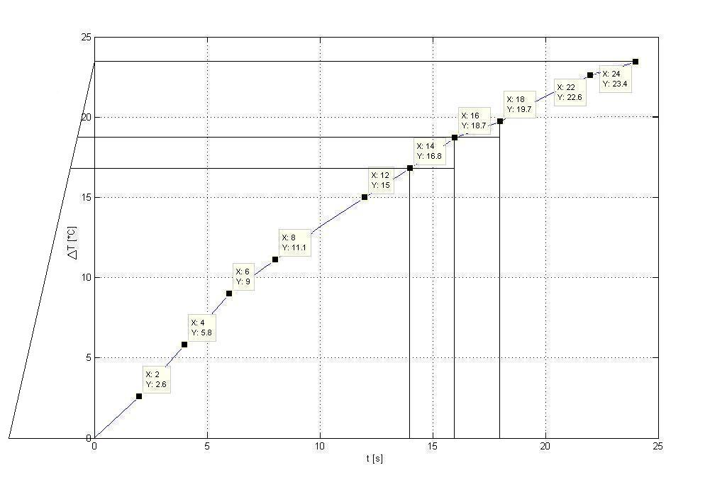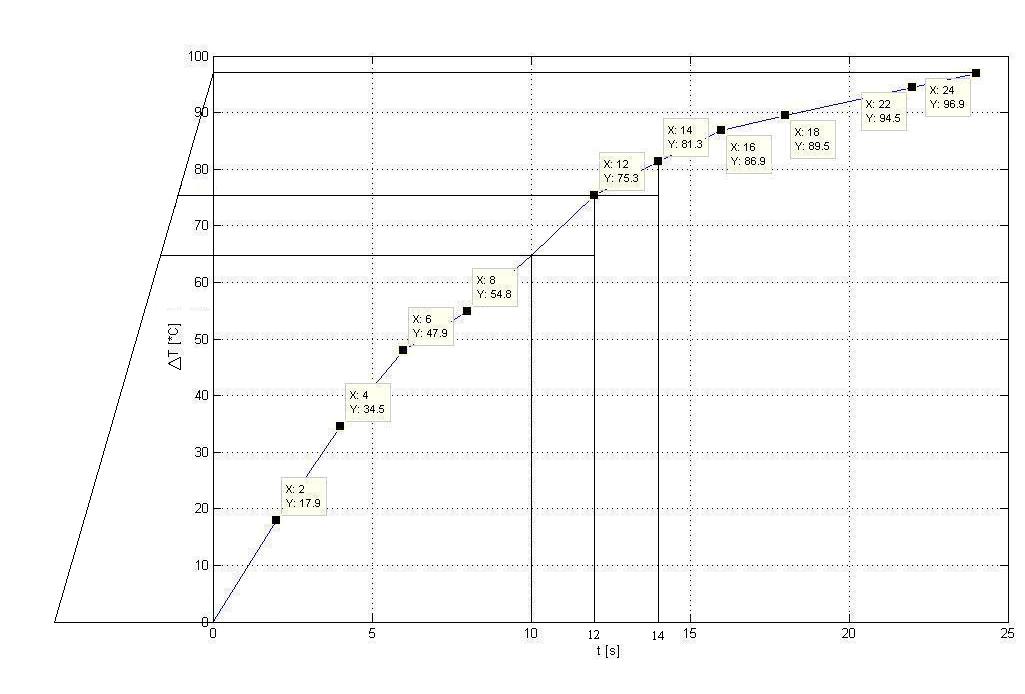 Jak widać z wykresu krzywa nagrzewania jest krzywą nieliniową, temperatura narasta coraz wolniej w miarę jak zbliżamy się do temperatury maksymalnej.