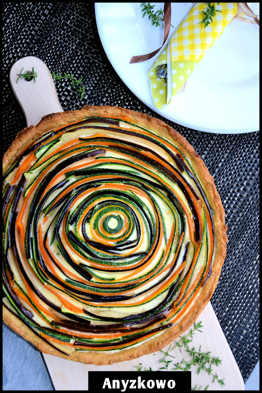 Przygotowanie : Do kubka wlej śmietanę dodaj jajko i rozbełtaj widelcem. Wsyp mozzarellę i wymieszaj składniki. Dodaj sól i pieprz. Mieszankę wylej na ostudzoną tartę. Bakłażan, cukinię i marchewkę pokrój wzdłuż na cienkie plasterki- jeśli będą szerokie przekrój na pół (najlepiej to zrobić obieraczką do warzyw wtedy paseczki wyjdą jednakowej grubości). Układaj paseczki obok siebie. Całość posmaruj oliwą i piecz w nagrzanym piekarniku do 170 stopni przez 20-25 minut.