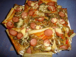 ciasto, na gore pokroic parowki ( moze byc zwykla kielbasa typu