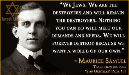 "My Żydzi, jesteśmy niszczycielami i nimi pozostaniemy. Nic nie możecie zrobić co byłoby zgodne z naszymi wymogami i potrzebami. Zawsze będziemy niszczyć, gdyż chcemy mieć własny świat". – Maurice Samuel, z książki "Wy Goje" / You Gentiles, s. 155