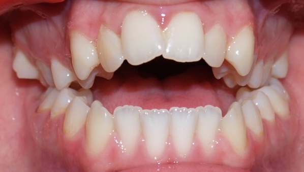 Zgryz otwarty – zęby dolnej szczęki nie schodzą się z zębami szczęki górnej w odcinku środkowym lub bocznym. Spółgłoski przedniojęzykowo-zębowe, tzn. t, d, n, s, z, c, ʒ, bywają wymawiane międzyzębowo.