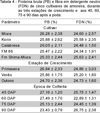 As concentrações de fibra em detergente neutro (FDN) não variaram entre os cultivares, oscilando ente 23 e 27% (Tabela 4). As menores concentrações de FDN foram registrados aos 60 e 75 DAP, respectivamente. Os níveis de FDN não sofreram influência marcante da estação nem do genótipo, mas somente do tempo entre a poda e a colheita das folhas.
