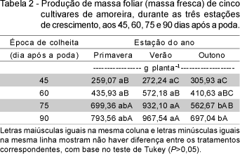 O cultivar 'Calabresa', apesar de ser extensivamente plantado no Estado de São Paulo (Takahashi, 1996), apresentou produção de massa foliar relativamente baixa nas três estações. Campos et al. (1980) verificaram que a produção de folhas de 'Calabresa' foi superada pelas variedades 'Formosa', 'Miura', 'Toshiana' e 'Yamada'. Fonseca et al. (1985; 1986) em estudos de competição entre vários híbridos de amoreira, obtiveram produções de folhas de 'IZ 19/13', 'IZ 5' e 'IZ 40' cerca de 100% maiores que da 'Calabresa', enquanto que 'IZ 56/4' produziu cerca de 200% mais que aquela variedade.